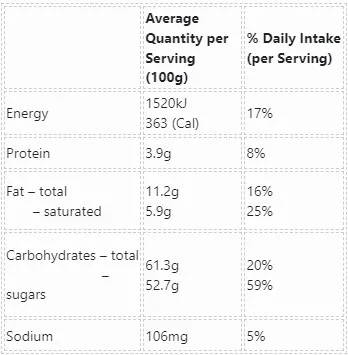 Fruit may contain pips. Allergens: Contains Wheat, Gluten, Milk, Egg, Almonds, Sulphites. May contain Soy, Pistachio, Macadamia Nuts, Pecans.